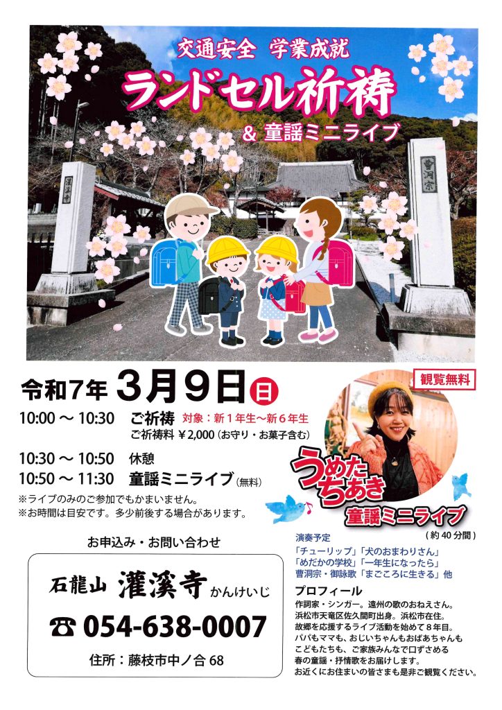 3/9(日)に幼稚園、小学生を対象として、健やかな成長を願い、学業成就・交通安全のご祈祷を行います。特に新1年生はランドセルをお持ち頂きご祈祷します。